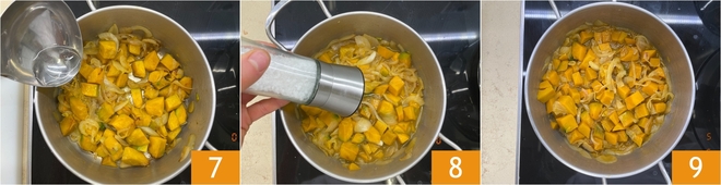 À ce stade, ajoutez 2 louches d'eau chaude 7, salez légèrement 8 et poursuivez la cuisson à feu moyen jusqu'à ce que le potiron soit tendre ; cela prendra environ 10 minutes 9.