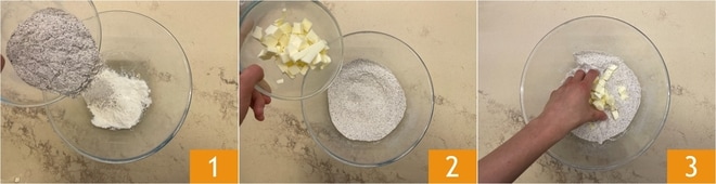 Pour préparer la galette avec pommes de terre et fromage, versez dans le bol les farines 1, salez et mélangez. Ajoutez le beurre en cubes froid 2, pétrissez rapidement du bout des doigts 3 comme pour pincer la pâte.