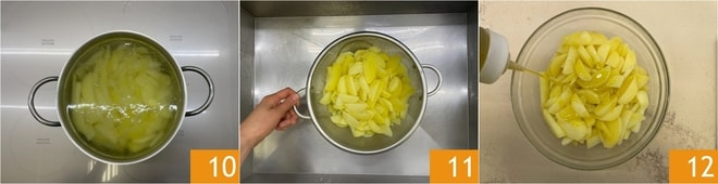 Une fois le temps écoulé 10, égouttez les pommes de terre 11 et laissez-les tiédir. Assaisonnez les pommes de terre avec de l'huile et du sel 12.