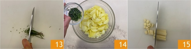 Hachez les herbes aromatiques 13 et versez-les sur les pommes de terre pour les parfumer 14. Coupez le fromage en cubes d'environ 0,5 cm 15.