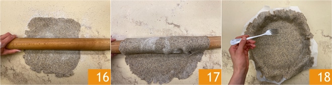 Sortez la pâte brisée du frigo, saupoudrez le plan de travail avec la farine de sarrasin, étalez la pâte à une épaisseur d'environ 0,3 mm 16. Ensuite, enroulez la pâte autour du rouleau à pâtisserie et déroulez-la sur un moule évasé (base inférieure 22 cm, base supérieure 26 cm) tapissé de papier sulfurisé. Percez la base avec une fourchette 18.