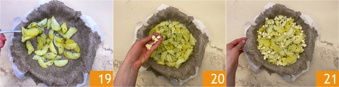 Garnissez avec les pommes de terre 19 et les cubes de fromage 20, puis repliez les bords vers le centre 21.