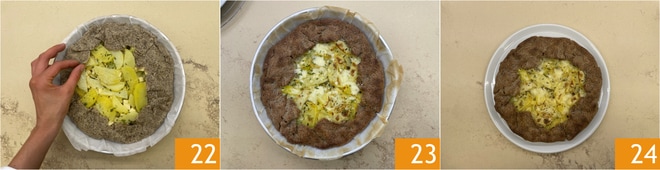 Pincez la pâte pour la sceller 22, puis faites cuire dans un four statique à 200° pendant 20 minutes. Continuez la cuisson en mode ventilé pendant 15 minutes supplémentaires. Sortez du four 23 et laissez tiédir avant de démouler et de servir la galette avec pommes de terre et fromage 24.