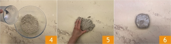 Versez l'eau froide et pétrissez encore rapidement dans le bol 4. Quand la pâte prendra consistance 5, déplacez-vous sur le plan de travail et pétrissez brièvement 5 jusqu'à obtenir un mélange homogène. Formez une boule, enveloppez-la dans du film plastique 6 et laissez reposer au réfrigérateur pendant 30 à 40 minutes.
