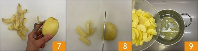 Pelez les pommes de terre 7 et coupez-les en deux puis en tranches de demi-centimètre 8. Faites cuire les pommes de terre dans une grande quantité d'eau bouillante salée pendant environ 10 minutes 9.
