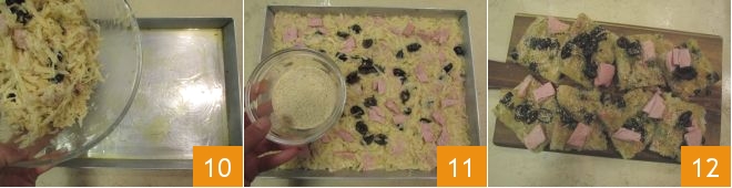 Huilez le fond d'un plat de 35x28 cm et répartissez uniformément la préparation à l'intérieur 10. Versez la chapelure sur la surface 11 et faites cuire dans un four statique préchauffé à 200° pendant 20 minutes, en plaçant le plat sur la grille du milieu. Passés 20 minutes, activez le grill et poursuivez la cuisson 3 minutes supplémentaires. Votre galette de pommes de terre aux olives et au thon est prête à être dégustée 12 !