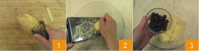 Pour préparer la galette de pommes de terre aux olives et au thon, commencez par éplucher les pommes de terre 1 et râpez-les avec une râpe à gros trous dans un grand bol 2. Ajoutez aux pommes de terre râpées les olives dénoyautées 3,