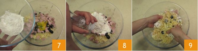 la farine 7, le sel 8 et le poivre, puis mélangez bien pour tout homogénéiser 9.
