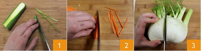 Pour préparer les galettes aux légumes julienne et Asiago, commencez par nettoyer et couper les légumes en julienne (vous pouvez aussi consulter l'École de cuisine : comment couper les légumes). Lavez bien les légumes sous l'eau courante, puis coupez les extrémités des courgettes et taillez-les en julienne 1. Faites la même opération avec les carottes 2 après les avoir épluchées et coupé les extrémités. Ensuite, coupez le fenouil en deux 3.