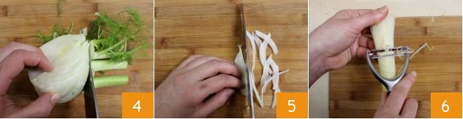 Retirez les cimes et l'enveloppe extérieure la plus dure 4. Ensuite, réduisez en julienne la quantité nécessaire de fenouil 5. Passez ensuite à l'élimination de la couche extérieure du céleri avec un épluche-légumes 6.