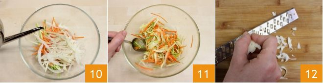 Réduisez également le céleri en julienne 7 puis transférez les légumes dans un bol. Salez et poivrez à votre goût (8-9).