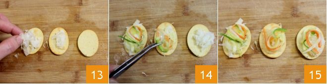 Commencez par le fromage pour composer les galettes : mettez une touffe de copeaux sur chaque galette 13. Puis aidez-vous des pinces de cuisine pour ajouter les légumes en julienne 14. Complétez l'opération pour toutes les galettes 15 et transférez-les ensuite sur une planche ou une assiette de service pour les offrir à vos invités !