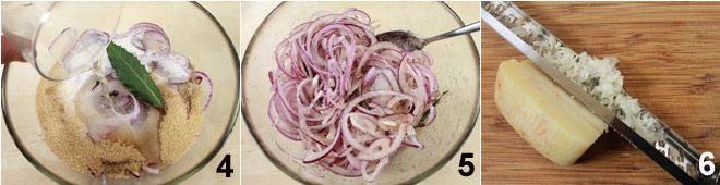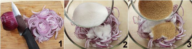 Commencez par préparer la confiture d'oignons rouges de Tropea : épluchez les oignons et coupez-les en tranches très fines 1 à l'aide d'une mandoline (ou d'un couteau bien aiguisé), puis placez-les dans un grand bol et ajoutez les clous de girofle, le sucre blanc 2 et le sucre de canne 3 ainsi que le laurier