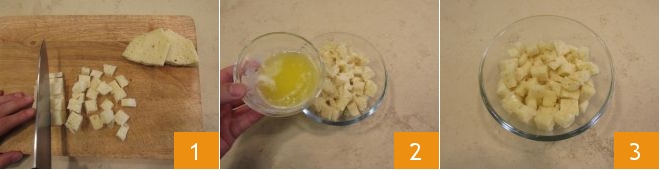 Pour préparer les galettes de canocchies, commencez par couper le pain blanc en tranches, enlevez la croûte et coupez la mie en cubes 1 ; transférez-les ensuite dans un bol et versez-y le beurre fondu 2. Mélangez bien et laissez reposer pendant au moins 10 minutes 3.