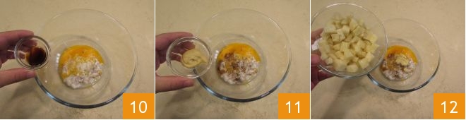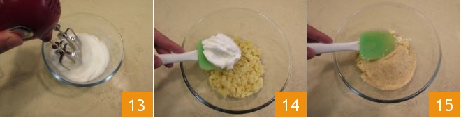 A ce stade, montez les blancs en neige 13 et incorporez-les délicatement au reste des ingrédients avec une spatule 14, puis ajoutez également la chapelure 15.