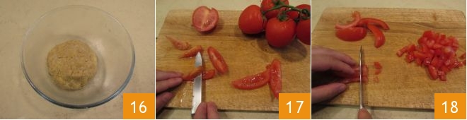 Mélangez jusqu'à obtenir une pâte homogène 16, couvrez avec du film plastique et laissez reposer au réfrigérateur. Pendant ce temps, préparez la sauce. Lavez les tomates, coupez-les en quartiers et enlevez la partie interne des graines 17, puis réduisez-les en cubes 18.