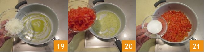Hachez l'oignon et transférez-le dans une casserole avec l'huile 19. Laissez-le fondre pendant quelques minutes à feu moyen 20 et ajoutez également les tomates. Saupoudrez-les de sucre et laissez-les caraméliser pendant quelques minutes 21.