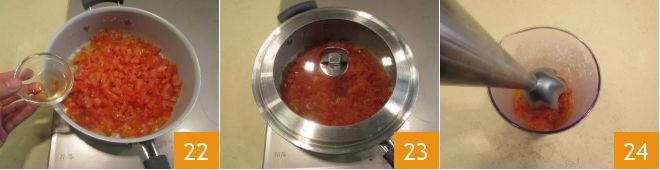 Déglacez avec le vinaigre de riz 22, couvrez avec un couvercle 23 et laissez cuire pendant environ 25 minutes, en remuant de temps en temps. Transférez le tout dans le bol du mixeur et mixez 24,