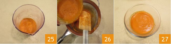 jusqu'à obtenir une crème 25. Passez-la ensuite au tamis 26, pour obtenir la consistance souhaitée, lisse et homogène 27.