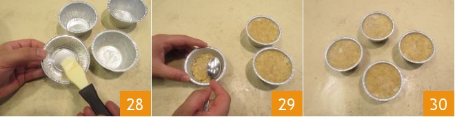 Prenez les moules jetables et beurrez-les 28, puis remplissez-les avec la préparation aux canocchies 29 et nivelez le dessus avec une cuillère 30.