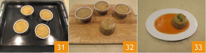Faites cuire dans un four statique préchauffé à 220° pendant 20 minutes 31 (si vous utilisez un four ventilé, cuisez à 200° pendant 15 minutes). Une fois cuits, démoulez vos galettes des moules 32 et servez-les accompagnées de la sauce aigre-douce à la tomate et de quelques feuilles de basilic 33.