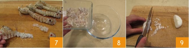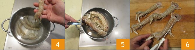Entre-temps, faites bouillir les canocchies pendant 2-3 minutes 4, égouttez-les 5, laissez-les refroidir et procédez au Comment nettoyer les canocchies. Coupez les appendices sur le ventre et taillez ensuite les côtés 6.