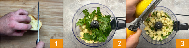 Pour préparer les gambas gratinées, commencez par couper la croûte du pain de blé dur 1 pour obtenir la mie. Réduisez-la en cubes et mettez-la dans un mixeur, ajoutez le persil 2, le zeste de citron 3 et mixez pendant 1 minute.