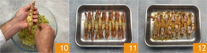 Garnissez les gambas 10 et placez-les sur un plat avec la panure vers le haut 11. Faites cuire à 200°C pendant environ 15 minutes, jusqu'à ce qu'elles soient bien dorées. Vos gambas gratinées sont prêtes à être dégustées 12.