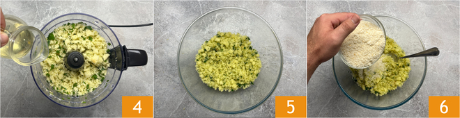 Ajoutez l'huile d'arachide 4 et mixez à nouveau pendant 1 minute. Transférez le tout dans un bol 5, ajoutez le panko et mélangez bien 6. Mettez de côté.