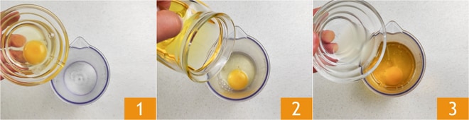 Pour préparer les crevettes à la sauce cocktail, commencez par vous occuper de la mayonnaise. Dans un récipient, mettez l'œuf 1, versez l'huile de graines 2 et le jus de citron filtré 3. Salez.