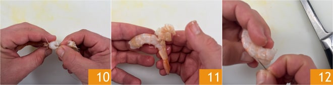 Nettoyez les crevettes, enlevez la tête 10, la carapace 11 et aidez-vous d'un cure-dent pour enlever l'intestin 12.