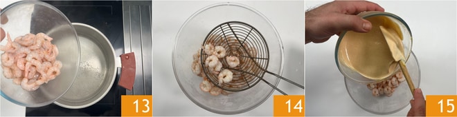 Dans une casserole, portez de l'eau à ébullition avec une pincée de sel, plongez-y les crevettes 13 et faites cuire pendant 2 minutes. Égouttez-les et transférez-les dans un bol 14. Laissez-les refroidir au réfrigérateur pendant 20 minutes. Passé ce temps, reprenez les crevettes et ajoutez la sauce cocktail 15.