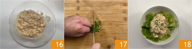 Mélangez délicatement jusqu'à ce que toutes les crevettes soient complètement enrobées de sauce 16. Ciselez finement la ciboulette 17. Lavez une laitue et gardez les plus belles feuilles, séchez-les et placez-les au fond de l'assiette, disposez dessus les crevettes et complétez avec une pincée de ciboulette. Vos crevettes à la sauce cocktail sont prêtes à être servies 18.
