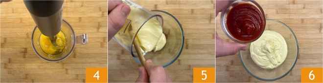 Mélangez avec le mixeur plongeant en le déplaçant de haut en bas 4 jusqu'à obtenir une émulsion stable et une mayonnaise de la bonne consistance. Transférez-la dans un bol 5 et ajoutez le ketchup 6.