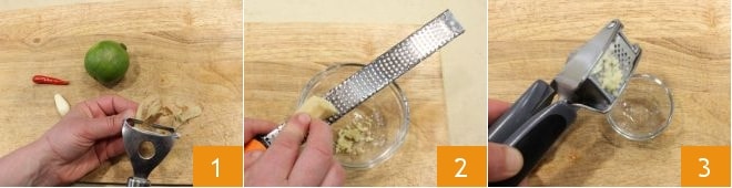 Pour préparer les crevettes rôties au miel, épluchez et râpez le gingembre frais (1-2), écrasez une gousse d'ail 3,