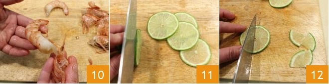 Entre-temps, Comment nettoyer les crevettes : retirez la tête et les pattes, enlevez la carapace 10 et extrayez avec un cure-dent l’intestin. Coupez en tranches très fines l'autre lime 11 puis découpez chaque tranche en 4 quartiers 12