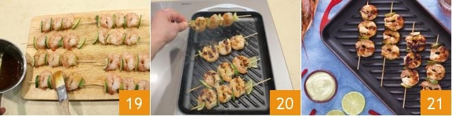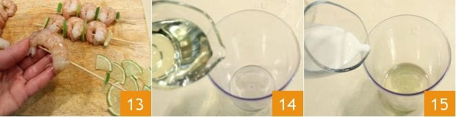 composez les brochettes : enfilez 3 crevettes sur une brochette en bois 13 et alternez avec une tranche de lime. Réservez et en attendant, préparez la Fausse mayonnaise sans œufs : dans un bol étroit et haut, versez l'huile de graines 14, le lait 15,