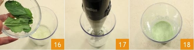 ajoutez une cuillère à café de jus de lime et les feuilles de menthe 16. Salez, poivrez et mixez avec le mixeur plongeant 18 jusqu'à obtenir une crème lisse 18.