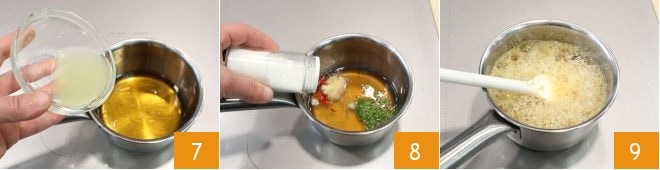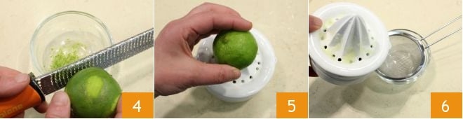 râpez le zeste d'un lime 4 et pressez-en le jus 5 puis filtrez-le à travers un tamis 6.