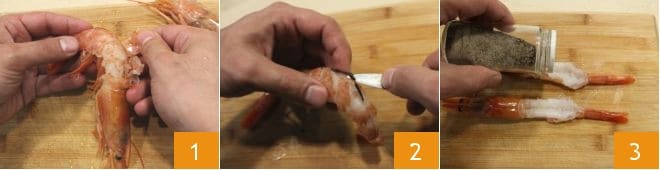 Pour préparer les crevettes en pâte kataifi avec sauce à la confiture d'abricot, commencez par nettoyer les crevettes : vous devez laisser la tête et la queue intactes, puis détachez délicatement la carapace des crevettes 1, incisez ensuite le dos avec un petit couteau et retirez l'intestin 2. Salez et poivrez les crevettes 3, saupoudrez-les de quelques feuilles de thym