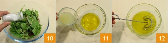 Ensuite, salez 10 et poivrez la salade à votre convenance, puis préparez une vinaigrette : versez l'huile d'olive dans un petit bol, ajoutez le jus d'un demi-citron pressé 11, les feuilles de menthe hachées et émulsionnez le tout 12, puis assaisonnez la salade mêlée.