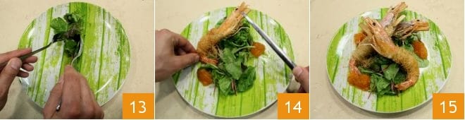 Répartissez-la dans les assiettes 13, assaisonnez également avec la confiture d'abricots autour de la salade et disposez trois crevettes par portion 14 : vos crevettes en pâte kataifi avec sauce à la confiture d'abricot sont prêtes à être dégustées 15 !