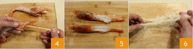 puis piquez-les avec un cure-dent (4-5) : de cette façon, vous pourrez enrouler plus facilement les crevettes avec la pâte kataifi et elles garderont leur forme à la cuisson. Prenez maintenant la pâte kataifi (elle se trouve surgelée dans les supermarchés, vous devrez donc la décongeler au réfrigérateur avant l'utilisation); effilochez-la avec les mains 6 pour élargir les fils.