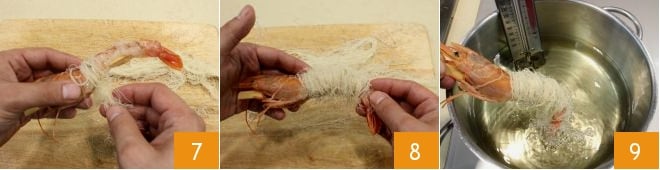 Ensuite, enroulez chaque crevette en commençant par la tête, jusqu'à la queue pour couvrir toute la partie centrale (7-8). Puis faites frire quelques crevettes à la fois dans de l'huile de graines bouillante, pendant environ 3 minutes (la température ne doit pas dépasser 170-180°C) 9 ; lorsqu'elles seront bien dorées, égouttez-les à l'aide d'une écumoire