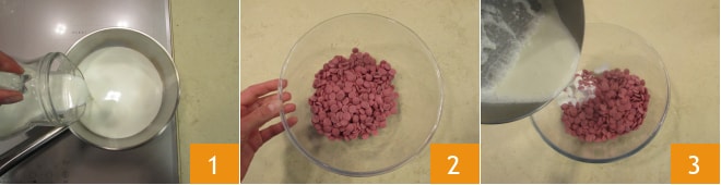 Pour préparer la ganache au chocolat ruby, commencez par faire chauffer la crème, laissez-la frémir 1. Pendant ce temps, versez le chocolat ruby en perles, ou haché au couteau, dans un grand bol 2. Dès que la crème est chaude, versez-la sur le chocolat 3.