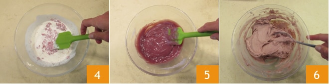 Mélangez immédiatement pour faire fondre le chocolat ruby 4 et, lorsque les ingrédients seront complètement amalgamés, vous pourrez utiliser votre ganache au chocolat ruby 5. Si vous préférez un effet monté, il suffira de couvrir la ganache avec un film plastique au contact et après au moins 2 heures de la travailler énergiquement avec une cuillère avant de l'utiliser 6.