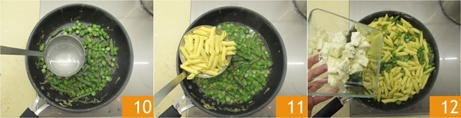 Ajoutez une louche d'eau de cuisson des pâtes sur les asperges 10, égouttez les garganelli dans la poêle 11 et terminez la cuisson. Éteignez le feu et ajoutez le gorgonzola 12.