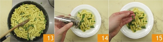 Mélangez bien 13 et servez les garganelli asperges et gorgonzola bien chauds avec du poivre à volonté 14 et quelques feuilles de marjolaine 15.