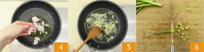 Ajoutez l'échalote 4 et laissez-la fondre 5. Coupez les asperges en rondelles 6
