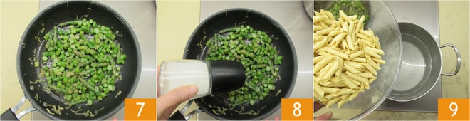 Ajoutez les asperges dans la poêle 7 et laissez-les cuire à feu moyen pendant environ 10 minutes, ou le temps nécessaire pour les ramollir, en les salant à mi-cuisson 8. Faites cuire les garganelli dans de l'eau bouillante salée 9 en réduisant la cuisson de deux minutes.